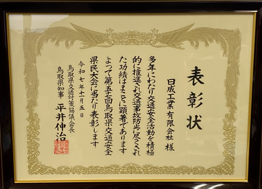 令和7年11月5日にとりぎん文化会館(鳥取市)で「第57回 鳥取県交通安全県民大会」が開催され、鳥取県安全運転運行管理者協議会連合会より推薦をいただき、同大会において鳥取県交通対策協議会長・平井伸治県知事より交通安全功労団体として受彰しました。