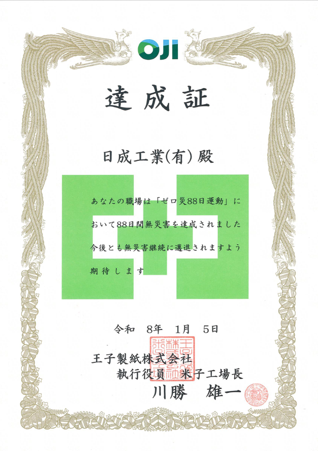 王子製紙㈱米子工場より「ゼロ災88日運動」無災害達成の表彰を受けました。