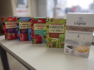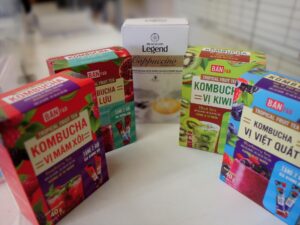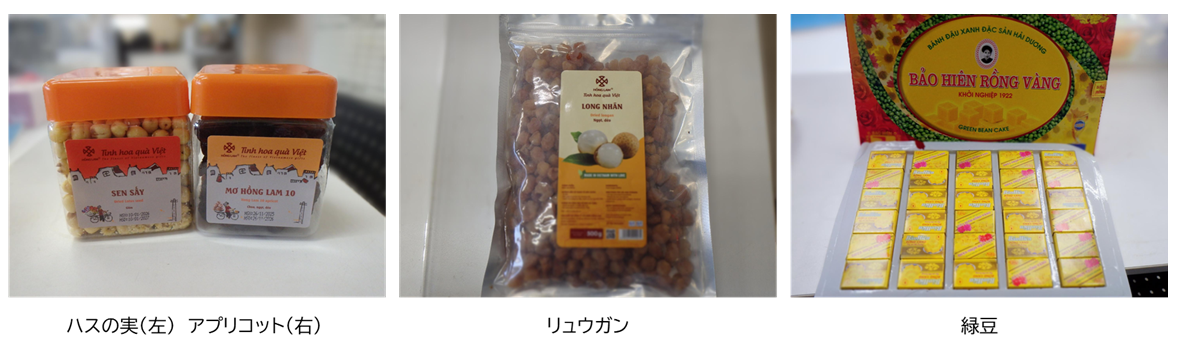 つづいては、お菓子の紹介です。(写真左)ベトナムでポピュラーなお菓子の『ハット・セン・サイ』と『オーマイ』。ハット・サン・セイはハスの実を、オーマイはアプリコットを乾燥させたドライフルーツで健康おやつとして食されているようです。(写真中)リュウガンと呼ばれるライチに似た果実を乾燥させた健康おやつです。滋養強壮・疲労回復の作用があるといわれており、特に女性や病後の滋養に良いとされているようです。(写真右)緑豆のケーキ『バイン・ダウ・サイン』。緑豆のペーストに材料を加え型に入れて固めたお菓子で、ベトナムの伝統的なお菓子です。ベトナムの方が愛飲されるコーヒーやお茶によく合うと人気の商品のようです。