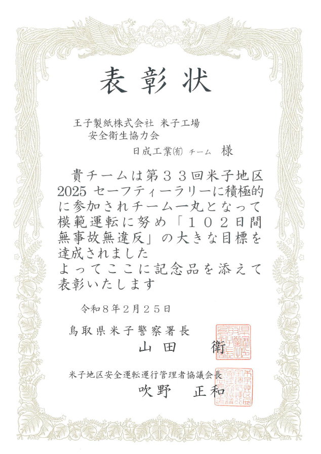 昨年9月よりスタートした「2025年米子地区セーフティーラリー」において、自社チームメンバーが102日間無事故無違反を無事に達成し、米子警察署及び米子地区安全運転運行管理者協議会より表彰状をいただきました。