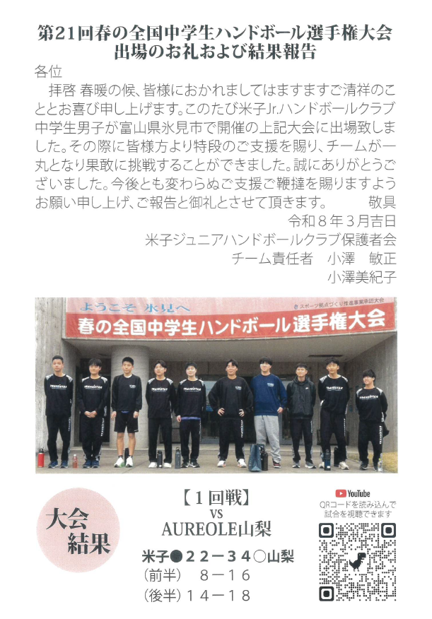 3月26日に富山県氷見市で開催された、第21回春の全国中学生ハンドボール選手権大会において、初出場を果たした米子ジュニアハンドボールクラブ(中学生男子)よりお礼と結果報告が届きました。